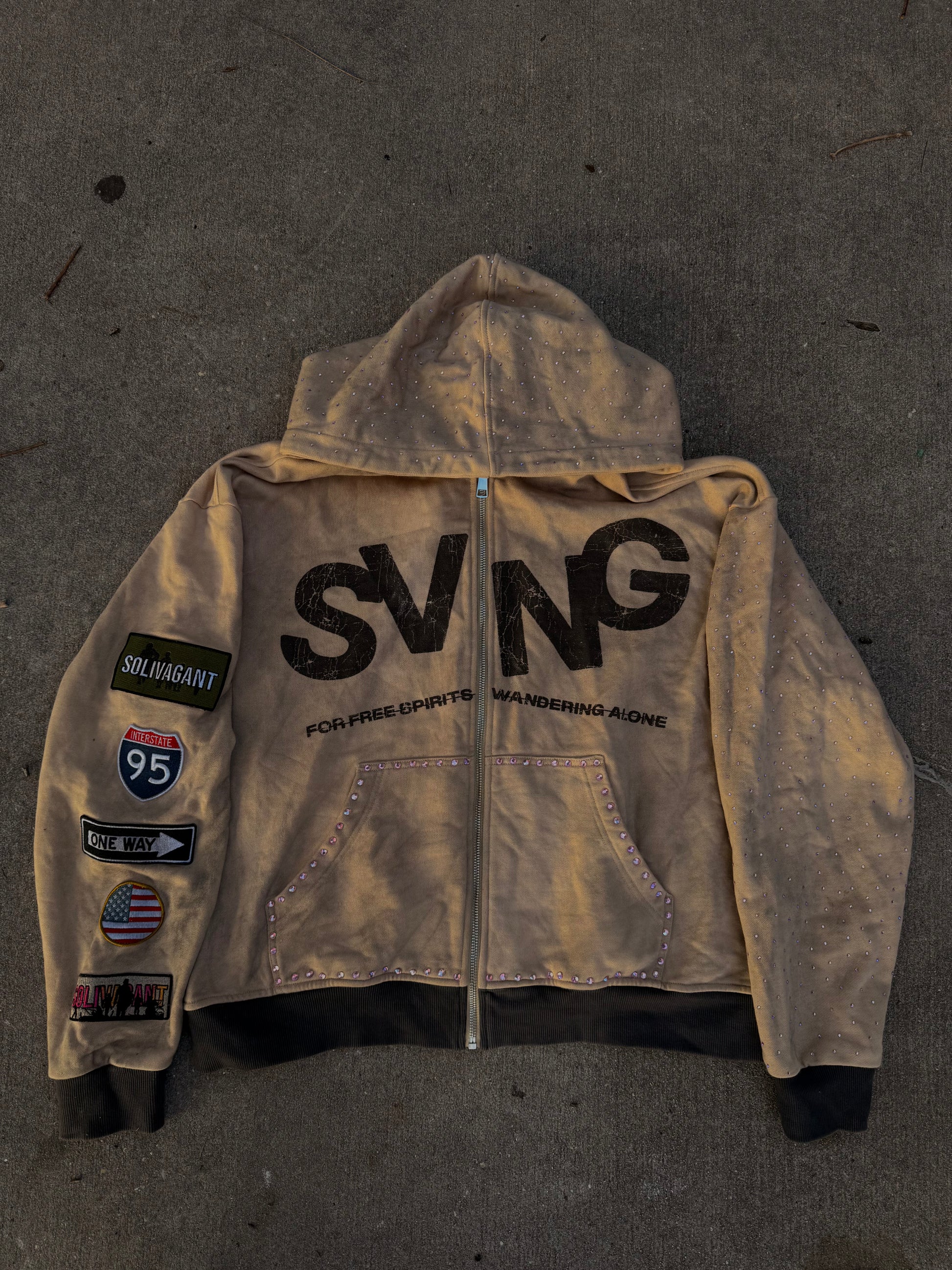 Crafted for the explorers, the dreamers, and those who walk their own path, the SVNG "Solivagant" zip-up hoodie is more than streetwear — it’s a statement. Featuring a bold front graphic that reads "SVNG – For Free Spirits Wandering Alone," and a powerful silhouette of armed camaraderie on the back under the phrase "Solivagant at heart, but better with crew," this piece blends rugged independence with collective spirit.
